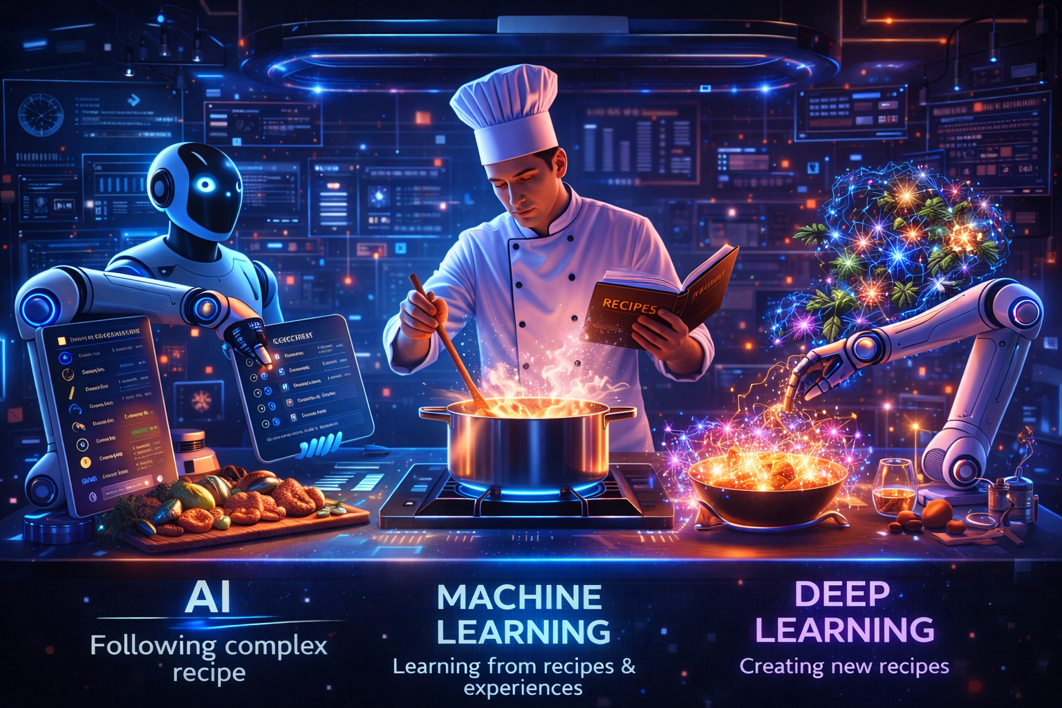Explain the difference between AI, machine learning, and deep learning using a cooking recipe analogy.