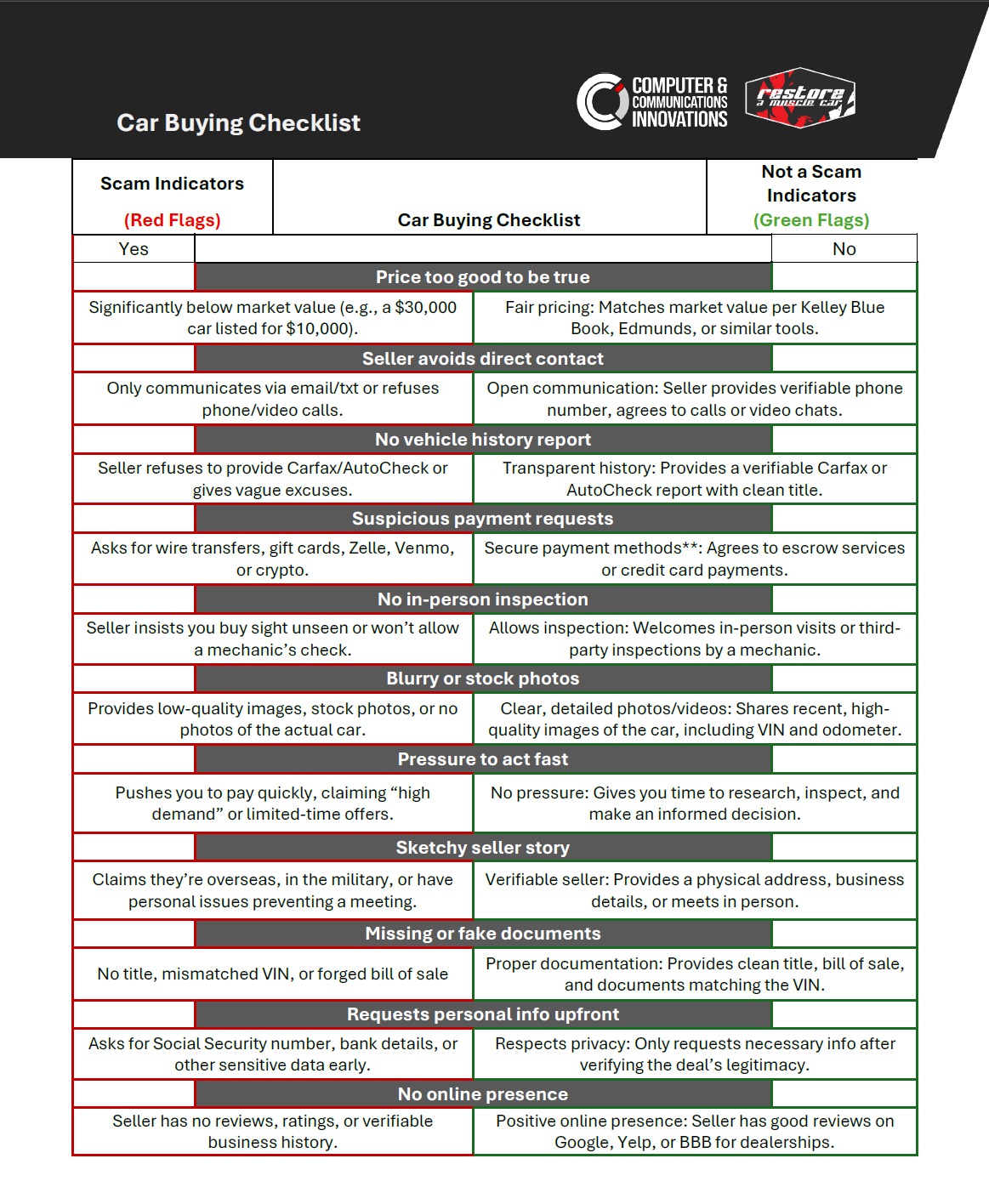Buying a car can be exciting—but it's also a common target for scammers. Don’t get caught off guard. Our Car Buying Scam Indicators Checklist helps you quickly identify red flags and confirm when a deal is legitimate. Whether you're buying from a private seller or dealership, this guide gives you the tools to make a safe, informed decision.